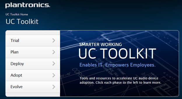 Plantronics introduced the “Smarter Working UC Toolkit” sometime back in 2011. The Toolkit is described in detail in the Plantronics datasheet for the Smarter Working UC Toolkit. I made it a point of going to the website to try and get the kit, and for those who haven’t seen it, the page looks like the picture included below: