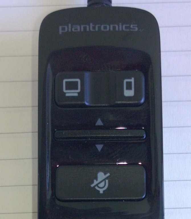 A button (left) is for controls for the PC softphone. On the right is the button for controls on the mobile device. The middle device is the volume control and the mute button is on the bottom. If you have the mute button activated, you get notification and frequent reminders via audio in the earpiece.