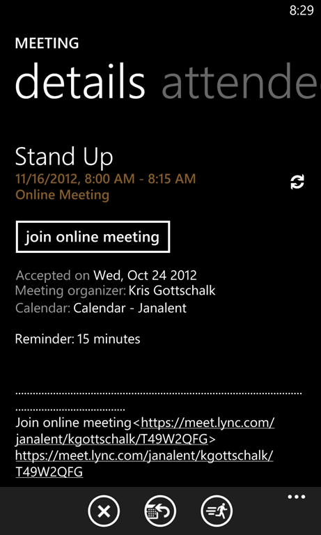 • Calendar – the calendar application has been enhanced (when used with the Lync application) to allow a 1-click to join audio conferencing.