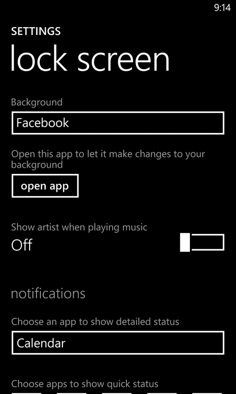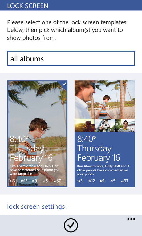 • Facebook – The Facebook application got some terrific upgrades with Windows Phone 8.  The upgrade that I enjoy the most is the new integration with the lock screen.  The lock screen can now utilize pictures that you have uploaded into facebook albums on the lock screen.  You can select the albums that are used for photos.  You still get the benefit of the notifications screens