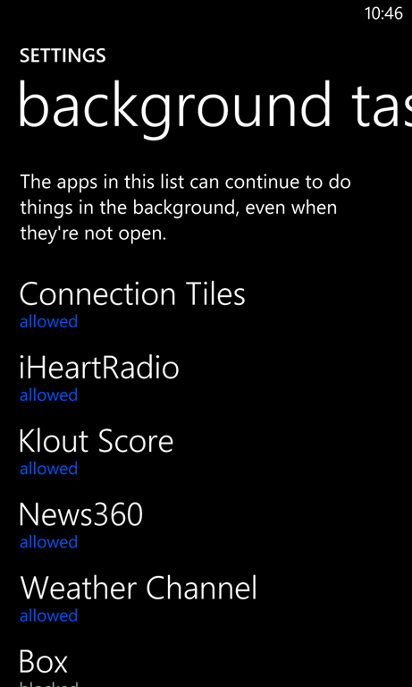 There have been some talk and blog posts about battery life on the Lumia 920.  Let me just go ahead and say that with all of these smartphones, there is a learning curve associated with learning what needs to be turned off and what needs to be kept on to maximize battery life while maintaining maximum functionality.  Inside the settings applet, there are a number of items that can be adjusted to impact the battery life of the phone.  By swiping to the left, you can make adjustments to applications and which applications can continue to work in the background.
